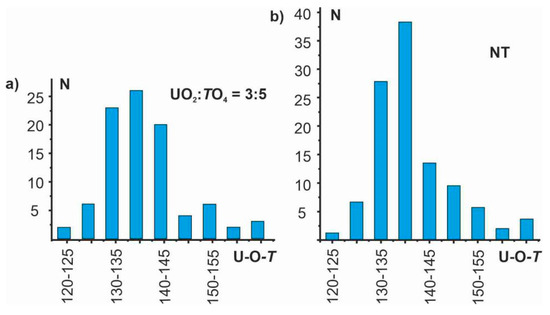 (a) The distribution of the U-O-T angles in known UO2:TO4 = 3:5 layers and (b) in NT.