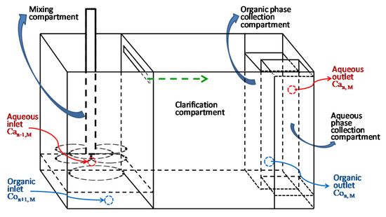Then, the mixed liquor overflowed into the clarification compartment and subsequently separated into an upper organic phase and a lower aqueous phase, respectively. Afterwards, the upper organic phase overflowed into the organic phase collection compartment and was sucked to the organic extractant inlets of the previous extraction tank. Lower aqueous phase flowed to the aqueous phase collection compartment and circuit to aqueous inlets of the next extraction tank.
