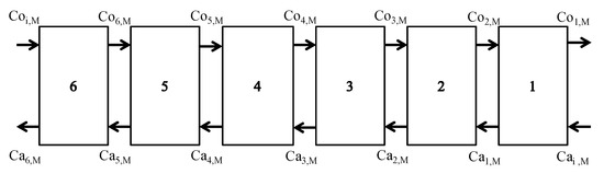 When; Con,M (n = 1–6 in Figure 3) was outlet metal (M = Mn, Co, Ni or Li) concentration of organic phase at the nth stage extraction tank; Con+1,M is inlet metal concentration of organic phase at the nth stage tank; Can−1,M is inlet metal concentration of aqueous phase at the nth stage tank; and Can,M is outlet metal concentration of aqueous phase at the nth stage tank. Coi,M is the feeding metal concentration of organic phase at the last stage tank and its metals concentrations are normally equal to zero. Cai,M is feeding metal concentration of aqueous phase at the first stage tank and its metal concentrations are normally equal to that of fresh acid leaching solution.
