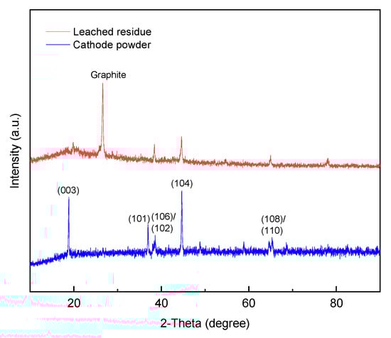 Figure 5 presents XRD patterns of recovered cathode powder and leached residue. The XRD pattern of recovered cathode powder shows several reflection peaks which match with previously reported pure single phase of LiNi1/3Co1/3Mn1/3O2 [52]. Comparing with the pattern of reported pure single phase, there are many noises in the patterns of recovered cathode powder because of impurity from spent LIBs. The pattern of leached residue shows a dominated reflection at 26.4° of 2θ which is the same as the reported diffraction patterns of the pure graphite powders [53]. Besides, leached residue also shows a few lower intensity peaks from remaining cathode powder. On the other hand, the reflection pattern of cathode powder shows no reflection at 26.4° of 2θ. The reason could be that graphite is shielded by cathode powder.