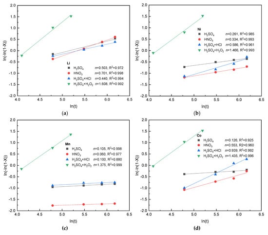 Various kinetics of leaching processes were studied by several studies. Among these leaching kinetics, Avrami equation is well verified for crystallization and later extended to other heterogeneous reaction systems [54]. Avrami equation is presented as ln(−ln(1 − x)) = lnk + nln(t), where x is the leaching efficiency of a metal; k is the reaction rate constant (min−1); t indicates leaching time (min) and n is a fitting parameter. Its integration form is x = 1 − exp(−ktn). In the Avrami equation, particular assumptions regarding leaching reaction and diffusion result in exact values of these constants. Zhang et al. researched cobalt leaching process in trichloroacetic acid with H2O2 media [55]. They indicated that the Avrami equation could be well used to describe the leaching process of cathode scraps. We also applied Avrami equation to study kinetic of leaching process. Figure 6 shows correlation of ln(−ln(1 − x)) to ln(t) of lithium, nickel, manganese and cobalt, respectively in different leaching media.