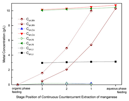 After de-aluminum and leaching, the leachate of cathode materials was processed to remove manganese with P-204 by a continuous-countercurrent-extraction process with three mixing–clarification tanks. When the extraction process reached equilibrium, two samples were taken from each tank including organic phase outlet and aqueous phase outlet. Figure 7 shows the metal concentrations of the feeding aqueous phase, feeding organic phase and inlet and outlet of each stage position in continuous-countercurrent-extraction process. The stage position numbers of 1, 2 and 3 in Figure 7 are the same as the stage numbers in Figure 3. The terms Con,M and Can,M are metal M (Mn, Co, Ni or Li) at nth stage in organic phase and aqueous phase, respectively. Feeding metal concentrations were showed as the first set of data at the rightmost side of Figure 7.