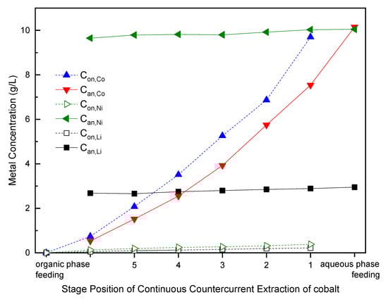 Figure 8 indicates that a six-stage process is necessary for effective cobalt removal from other metals in the aqueous phase. The stage position numbers of 1, 2, 3, 4, 5 and 6 in Figure 8 are the same as the stage numbers in Figure 3. The terms Con,M and Can,M are metal M (Co, Ni or Li) at nth stage in organic phase and aqueous phase, respectively. Concentrations of Ni and Li in the aqueous phase slightly decrease from the inlet (feeding) at stage 1 to the final outlet at stage 6. Concentrations of cobalt in aqueous phase decrease from the inlet at stage 1 to the final outlet at stage 6. Simultaneously, concentrations of Co in organic phase increase from the inlet (feeding) at stage 1 to the final outlet at stage 6. The metals concentrations of Co, Ni and Li in the last extracted organic phase were 9.7, 0.38 and 0.22 g/L at stage 1. Furthermore, purity of Co was 94% and can be improved subsequently by impurities scrubbing and cobalt stripping. Our previous study demonstrated that the purity of plating cobalt foil can reach 98.80% [37]—or even up to 99.96% with deep impurity removal before cobalt electrowinning.