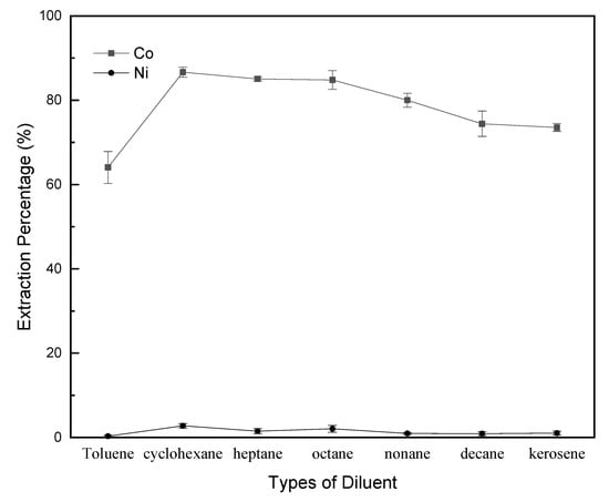 First, the effectiveness of diluents was investigated. The extraction and separation results are shown in Figure 9. The effectiveness of the diluents for the extraction of Co and Ni are presented as their extraction percentages. The separation factors βCo/Ni are 553, 227, 372, 263, 416, 416, 315 and 265 when using toluene, cyclohexane, heptane, octane, nonane, decane and kerosene, respectively.