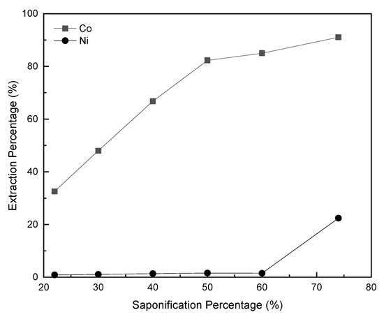 When the saponification percentage rose from 20% to 60%, the extraction percentage of cobalt increased from 33% to 86%, but its nickel remained below 2%. At 50% to 60% saponification ratio, the extraction equilibrium pH was between 4.5 and 5.2. When the saponification ratio reached 70%, the cobalt extraction percentage become 91%, the nickel extraction percentage increased to 22%, and the extraction equilibrium pH was 6.2. The highest effectiveness was achieved when the saponification percentage was controlled at 60%, regarding the extraction percentage and separation efficiency of cobalt and nickel.