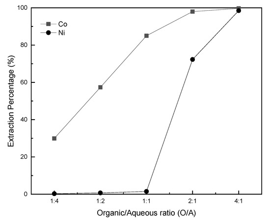 If the organic/aqueous ratio increases continuously, it can be found that nickel enters the organic phase in large quantities, because of the excessive extractant and results in a poor separation between cobalt and nickel. When the organic/aqueous ratio reached 4:1, cobalt and nickel were almost completely extracted.