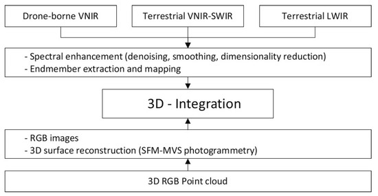 Kirsch et al. [43] presented an integrated workflow for the geometrically and spectrally accurate combination of SfM multi-view stereo point cloud and hyperspectral data (i.e., visible and near-infrared (VNIR), short-wave infrared (SWIR), and long-wave infrared (LWIR)). Figure 2 shows a schematic processing workflow for integrating VNIR–SWIR–LWIR hyperspectral data. In addition, to validate the proposed workflow, they conducted an extensive geological field survey and collected SfM photogrammetric and hyperspectral ground-based VNIR-SWIR and LWIR, as well as UAV-based VNIR datasets. To this end, the Naundorf gravel quarry, located in the state of Saxony, Germany, was selected as a case study. First, image processing of the VNIR-SWIR data was performed based on minimum wavelength (MWL) mapping, band ratio, and endmember-based classification. Next, the MWL maps were evaluated via comparison of the absorption in the image and sample spectra. Two major lithological zones were successfully distinguished based on this analysis. Furthermore, the LWIR hyperspectral data were used to distinguish the types of rocks dominated by quartz and plagioclase.