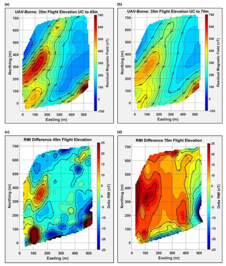 The 35-m flight elevation residual magnetic intensity (RMI) grid upward continued to (a) 45 m above ground level (AGL) and (b) 70 m AGL. The difference between the upward continued RMI grid subtracted from the directly measured RMI grid at (c) the 45-m flight elevation and (d) 70-m flight elevation [51].