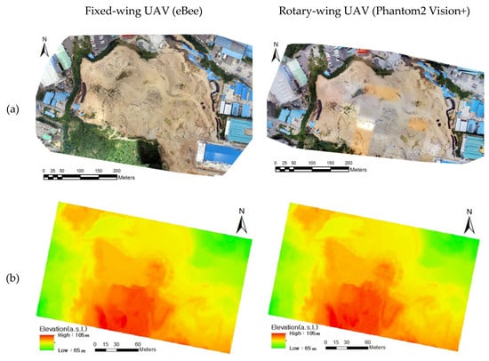 Fixed-wing and rotary-wing UAVs differ in the characteristics, such as flight altitude, speed, time, and performance, of the attached cameras. Lee and Choi [60] compared the results of aerial photogrammetry, which differed for each aircraft type, in the same study area. To achieve this, a construction site located in Yangsan-si, Gyeongsangnam-do was set as the research area. Orthomosaic images and DSM with a 4-cm/pixel spatial resolution were produced using the acquired aerial photographs. Furthermore, coordinates were measured on the ground using DGPS for seven ground control points (GCPs). From a comparison between the aerial survey and ground survey, the RMSE was analyzed to be approximately 10 cm. The fixed wing showed a relatively negligible error when the results of the two types of aerial surveying were compared. Figure 4 shows the orthographic images and DSMs of the study area for the two types of UAVs.