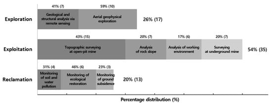 Many studies on UAV technology have been conducted in the mining industry. Cress et al. [33] established a roadmap for using unmanned aerial systems (UASs) in geological surveys conducted in the United States. They also presented practical applications, such as monitoring of abandoned mines and waste. Lee and Choi [34] reviewed the trends and applications of UAV technology in the mining industry. In particular, the usage of UAVs for topographic surveys was presented in detail. Paisiriyuenyong [35] provided a brief explanation of how to use UAVs at each stage of mine development, and Ren et al. [36] reviewed case studies on the use of UAVs for mine operations, such as terrain surveying and 3-D modeling, land damage assessment, ecological environment monitoring, and pollution monitoring. Buczyńska [37] reviewed a few cases where UAVs were used in the reclamation phase, and Dering et al. [38] conducted a review of the UAV-based structure from motion (SfM) methodology that can be applied to the mapping and analysis of dykes and their host rocks. However, no systematic review has been performed on the applications of UAVs in mining by classifying the entire mining process into the three phases of exploration, exploitation, and reclamation.