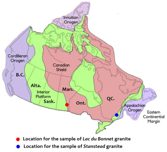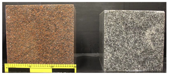Figure 2 shows the cuboidal samples. Typical images of 150 mm diameter cores of the two granites are shown in Figure 2. The samples of the Lac du Bonnet granite were obtained from a depth of approximately 16 m and the pink colour is attributed to interaction with groundwater [59,65]. As noted in [63], the pink colour extends to a depth of 185 m, below which the rock exhibits a gray colour similar to the Stanstead granite.