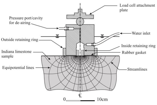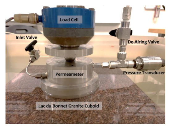 The surface permeameter was developed by Selvadurai [99] and first used to estimate the near-surface permeability characteristics of a cuboid of Indiana limestone measuring 450 mm. It consists of an arrangement to provide a sealing annular patch region of inner diameter 25.4 mm and outer diameter 101.6 mm. The annular sealing gasket is made of neoprene rubber with a hardness of 40 measured by a Shore A durometer. The sealing is provided by the application of a uniform axial stress over the entire annular region, which is provided by a solid stainless steel housing that also has a water entry port, a de-airing port and an attachment for applying an axial load to develop the sealing action (Figure 3). The permeameter also has stainless steel containing rings to prevent radial expansion of the annular seal both during application of the sealing stress and the internal pressure needed to initiate steady flow. This arrangement also prevents creep deformations of the gasket region that can influence the development of a constant pressure within the interior region of the annulus. The axial sealing stress that needs to be applied to the gasket region will depend on the pressure applied to the interior of the annular seal to develop flow through the rock that is being tested. In the experimental research that involved testing a large cuboidal region of Indiana limestone [100], an axial sealing stress of 1.5 MPa was applied to initiate the sealing action and the fluid pressure applied to initiate flow was less than 250 kPa. The axial load was measured using a load cell (Inter-Technology Model 1200 with a load capacity of 44.5 kN and with an accuracy of +/− 0.04%). The axial load is applied to the permeameter through a hydraulic jack that is attached to a test frame (Figure 2). When testing the granite permeability, the axial sealing stress was maintained at 1.5 MPa and the reliability of the interface sealing action was examined in a separate experiment where the permeameter was in contact with a Plexiglas plate placed on the surface of the granite cuboid. The cavity was subjected to a pressure of 250 kPa and the fluid pressure in the region was sealed. Any time-dependent decay in the cavity fluid pressure at a sealing stress of 1.5 MPa was monitored. The maximum stabilized reduction in cavity pressure over a one-hour period was less than 0.3%. Since the maximum duration of surface permeability tests conducted on both granitic rocks was less than 50 h, the sealing action achieved by the sealing stress of 1.5 MPa was considered to be satisfactory.