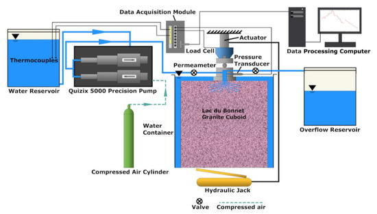 The temperature of the fluid was monitored using two Type K thermocouples. The Quizix 5000 Precision pump was controlled using the PumpWorks Software to regulate and monitor pump performance. All the data from the pump sensors were recorded by the PumpWorks software and other sensors recorded data using a Data Acquisition Module (Model No iNet-400) and the data were recorded and stored in a desktop computer, which was also used for data processing. A general view of the experimental facilities is shown in Figure 4 and a schematic view of the experimental arrangements is shown in Figure 5. A detail of the permeameter and the Lac du Bonnet cuboid assembled for surface permeability testing is shown in Figure 6.