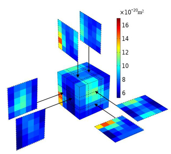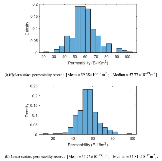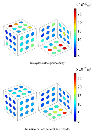The objective of the experimental research is to provide a technique whereby the results for the surface permeabilities can be used to develop estimates for the spatial permeability distributions in the interior of the cuboidal specimens. The procedures that can be adopted for such estimations can be varied, ranging from the use of kriging procedures to other techniques based upon solids modelling approaches available in codes such as AutoCAD. Recently, the LOFT option in the AutoCAD program was used to map the distribution of heterogeneities in samples of the argillaceous Cobourg limestone measuring 80 × 120 × 8 mm [73]. This procedure was a feasible option when the modelling involved only an extrapolation of surface features through the 8 mm thick region. As shown in [100], for extrapolation of the surface permeabilities to the interior of the three-dimensional cuboidal specimen, recourse must be made to alternative procedures such as kriging. The details of the procedures are given in [100,119] and therefore only the results of the kriging procedure for estimating the distribution of permeability at the interior of the cuboid are recorded here. The kriging procedure was performed using EasyKrig v.3.0 provided in the Matlab software.