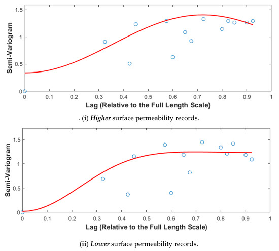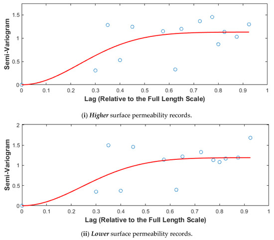 Using the surface permeability data corresponding to the Higher and Lower permeability data for the Stanstead granite (Figure 8) and the Lac du Bonnet (Figure 10), it is possible to perform statistical evaluations of the datasets. The semi-variograms for the Higher permeability and Lower permeability surface data obtained for the Stanstead granite are shown in Figure 11. We note that the range of the semi-variogram for the Stanstead granite passes the inter-quartile statistical requirements Q1 and Q2 [120].