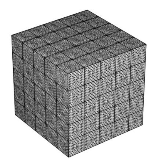 The heterogeneous distribution of permeability determined in the previous section was used to estimate the effective permeabilities measured along three orthogonal directions aligned with the edges of the cuboidal regions. These values were estimated using finite element computations of the one-dimensional fluid flow by imposing a constant potential, , over one surface of the cuboidal region, zero potential, , on the surface directly opposite to it and null Neumann or impermeable boundary conditions (i.e., , where is the outward unit normal to the surfaces) on the remaining four surfaces. The computational multiphysics code COMSOL™ was used for all the finite element simulations of fluid flow. The finite element discretization of the cuboidal regions uses four-noded tetrahedral elements and a typical domain discretization is shown in Figure 19. The mesh of the models simulating different test locations (central, corner and midway) was refined around the annulus region of the permeameter to better describe its circular boundaries. Altogether, 2,053,470 elements were used to model the cuboidal regions. The number of degrees of freedom associated with the discretization was 2,774,035. The computational accuracy of the COMSOL™ Multiphysics finite element code was established through comparisons with known analytical solutions that involved theoretically singular solutions for the flow potential and through inter-code calibrations [76,77,78,79,80,81,82,83,84,85,86,100,101,114,115].
