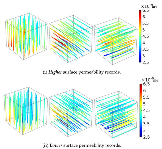 The computational procedure can be used (i) to examine the flow pattern within the cuboidal regions to observe the influence of the permeability heterogeneity on the flow pattern and (ii) to estimate the one-dimensional permeabilities that require the flow paths to preserve the nearly rectilinear uniform flow within the cuboid. The flow patterns obtained for the Stanstead granite for the spatial permeabilities illustrated in Figure 12 and Figure 13 are shown in Figure 20. Similarly, the flow patterns obtained for the Lac du Bonnet granite for the spatial permeabilities illustrated in Figure 16 and Figure 17 are shown in Figure 21. In both instances, the one-dimensional flow paths are largely rectilinear, and the marginal influence of the permeability heterogeneity is observable.