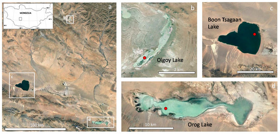 Google Earth images of (a) the Valley of Gobi Lakes (location in Mongolia provided in the inset map), (b) Olgoy Lake, (c) Boon Tsagaan Lake, and (d) Orog Lake. Red circles in (b,d) indicate the sampling points in each lake.