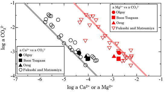 Relationship between the activity (log scale) of CO32−, and that of Ca2+ (black symbols) or Mg2+ (red symbols) in waters from Olgoy, Boon Tsagaan, and Orog Lakes and other alkaline lakes worldwide [13]. Straight black and red lines are the solubilities of MHC and AMC, as experimentally estimated by Fukushi and Matsumiya [13].