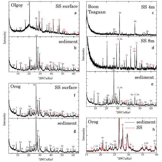 XRD patterns of suspended matter (SS) and benthic sediments from (a,b) Olgoy, (c–e) Boon Tsagaan, and (f,g) Orog Lakes. (h) Comparison of XRD patterns of suspended matter (red) and sediment samples (black) from Orog Lake. Mineral abbreviations: M, monohydrocalcite; C, calcite; Qz, quartz; Pl, plagioclase; I, illite; Ch, chlorite; and Ha, halite.