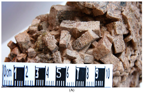 As stated before, gehlenite was one of most studied minerals in the high-temperature skarns from Măgureaua Vaţei (e.g., [4,5,6,8]). The mineral occurs in practically monomineralic blocks, in the outer endoskarn zone from Cerboaia Valley contact. In the classical outcrop described by [5,6], the crystals, with a short prismatic to tabular habit, may reach up to 8 cm across. A macroscopic image of a gehlenite aggregate from this famous outcrop is given in Figure 3, whereas a microscopic image is given in Figure 4A.