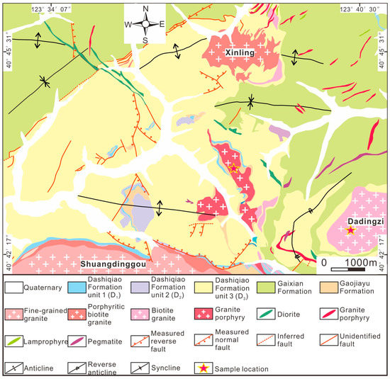 Geological map of the Qingchengzi district (after Li et al. [44]).