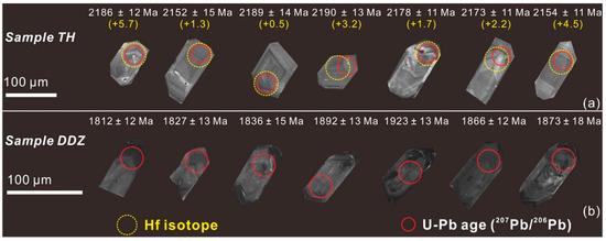 We separated and analyzed 23 zircons from sample TH and 20 zircons from sample DDZ. For the representative zircons, CL images are shown in Figure 4 and the U-Pb data (Supplementary Table S1) are displayed graphically in Tera–Wasserburg diagrams (Figure 5). All of the zircon grains show obvious oscillatory growth zone and a high Th/U ratio (0.11–1.79; Supplementary Table S1), suggesting that they are of magmatic origin [51].