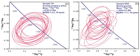 A total of 23 spots were analyzed on 23 zircon grains from sample TH (Supplementary Table S1). Seven analyses were excluded because of high discordance (>5%). The remaining 16 spots had Th/U ratios and 207Pb/206Pb ages varying from 1.14 to 1.71 and 2190 to 2131 Ma, respectively (Supplementary Table S1). They plot on concordia with a weighted mean 207Pb/206Pb age of 2163 ± 9 Ma (n = 16; MSWD = 2.0) (Figure 5a), which is interpreted as the emplacement age of the granite porphyry.