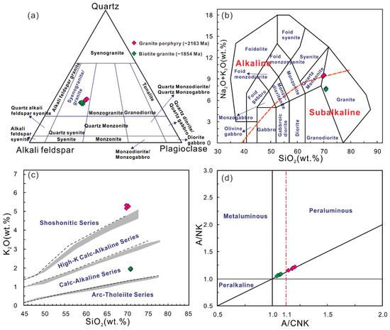 Major element geochemical diagram of igneous rocks in Qingchengzi district. (a) Modal quartz–alkali feldspar–plagioclase classification (after Le Maitre [52]); (b) total alkali (Na2O + K2O) vs. SiO2 (after Irvine and Baragar [53]); (c) K2O vs. SiO2 (after Peccerillo and Taylor [54]); and (d) A/NK vs. A/CNK (after Maniar and Piccoli [55]).