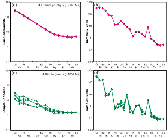 Trace element geochemical diagram of Paleoproterozoic igneous rocks in Qingchengzi district (Note: the normalized values of chondrite and N-MORB are from Sun and McDonough [56]). (a,c) Chondrite-normalized rare earth element patterns, (b,d) N-MORB normalized trace element patterns.
