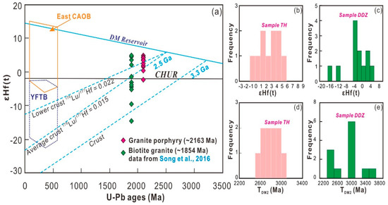 The εHf(t) vs. U-Pb ages (Ma) diagram for the Paleoproterozoic igneous rocks from the Qingchengzi district. Abbreviations: YFTB = Yanshan fold and thrust belt (Yang et al. [59]); CAOB = Central Asian Orogenic Belt; CHUR = chondritic uniform reservoir; DM = depleted mantle. (a) εHf(t) vs. U-Pb ages (Ma) diagram, (b,c) Histograms of εHf(t) values, (d,e) Histograms of TDM2 ages.