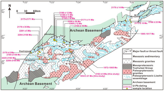 Geological sketch and age distribution of the northeastern Jiao-Liao-Ji Belt (modified after Bi et al. [34] and Dong et al. [35]). Note: the age data in the figure are listed in Supplementary Table S4.