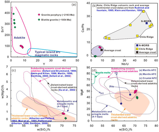 Discrimination diagrams of Paleoproterozoic adakitic rocks in the Qingchengzi district. (a) Sr/Y vs. Y (after Defant and Drummond [61]; Martin [63]); (b) Ce/Pb vs. Nb/U (Chile Ridge volcanic rock and average continental crust data are from Klein and Karsten [72], Rudnick and Fountain [73], Muir et al. [74]); (c) MgO vs. SiO2; (d) Mg# vs. SiO2.