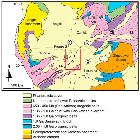 Precambrian tectonic framework of Southern Africa (modified from [22]). western edge of Archaean cratons; boundary between 2.05–1.8 Ga orogenic belts and 1.35–1.0 Ga belts; boundary between 1.35–1.0 Ga belts and Pan-African belts; western edge of Pan-African belts. IB = Irumide Belt; M = Matchless Belt; OML = Otavi Mountainland; ZB = Zambezi Belt. The red square indicates the position of map in Figure 2.