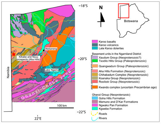 Subsurface geological map of northwestern Botswana, with the location of the Kihabe and Nxuu prospects (modified from [13]). The Kalahari cover is not shown.