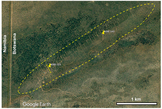 Satellite photograph of the Kihabe prospect (from Google Earth; image 2008), with the position of the analyzed drill holes: KDD 125: 19°42′3.81″ S latitude, 21°0′29.78″ E longitude; and KDD 143: 19°41′38.37″ S latitude, 21°1′15.71″ E longitude. The yellow dashed line represents the outline of the mineralization. In correspondence of the drill hole KDD 125, the projection of the geological section depicted in Figure 4 is indicated.