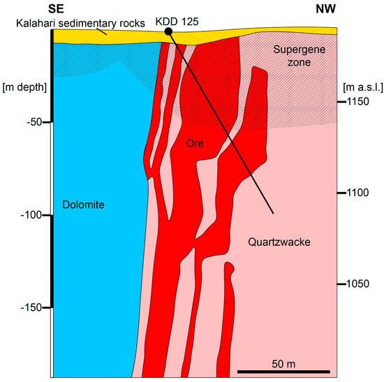 Schematic geological section of the Kihabe mineralized body (modified from [11]). Ore = outline of the ore bodies based on drillcore 3D modeling [11]. See Figure 3 for the location of the cross section within the prospect area.