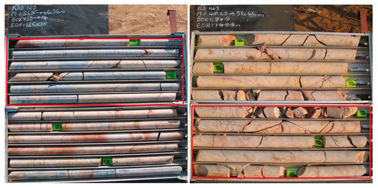 Pictures of drillcore trays with the analyzed drillcore intervals (enclosed in the red line): KDD 125: interval 55.00–60.90; and KDD 143: interval 50.00–54.93. In both the cores it is possible to see reddish intervals, affected by supergene alteration.