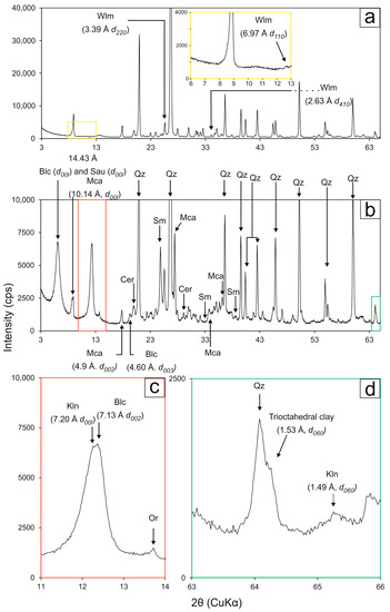 Examples of XRPD patterns of willemite- and baileychlore-bearing samples: (a) Sample KDD143-16: XRPD pattern showing characteristic peaks of willemite (other minerals identifiable in the patter are quartz, muscovite and smithsonite; see Table 1); (b) Sample KDD143-26: XRPD pattern showing characteristic peaks of major phases occurring in the sample; (c) and (d) enlargements of (b) showing characteristic peaks of baileychlore. Notes: unspiked peaks in the XRPD pattern of sample KDD143-26 correspond to minor reflections of orthoclase. Blc = baileychlore; Cer = cerussite; Kln = kaolinite; Mca = mica (undistinguished; see text for details); Or = orthoclase; Qz = quartz; Sau = sauconite; Wlm = willemite.