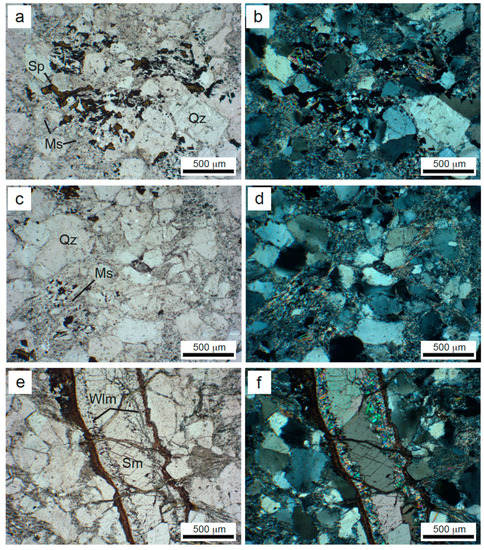 Transmitted light micrographs: (a) and (b) Sample KDD 125-8: Sphalerite dispersed in the quartzwacke matrix, in between micas with decussate structure (NII and N+); (c) and (d) Sample KDD 125-8: Quartzwacke with schistose structure (NII and N+); (e) and (f) Sample KDD 143-16: Vein consisting of willemite and smithsonite (NII and N+). Ms = muscovite; Qz = quartz; Sm = smithsonite; Sp = sphalerite; Wlm = willemite.