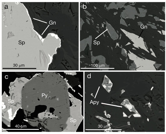 In the drillcore KDD 125, sphalerite appears to be interstitial in the quartzwacke (Figure 7a,b), intergrown with quartz and mica (Figure 8a). Locally, sphalerite is slightly ferroan (3–4 wt. % Fe) and can contain up to 1–2 wt. % Pb, with subordinate As (0.3 wt. %). Galena occurs either at the rim of the sphalerite crystals or in the porosity of the host rock (Figure 8a,b). Pyrite is relatively rare (Figure 8c), and contains variable amounts of As and Cu (rarely Co). Locally, arsenopyrite has been observed in association with sphalerite (Figure 8d). Argentite micrograins are dispersed within the above-mentioned mineral assemblage, both in the sulfides and the quartz gangue. At the microscale, sulfides appear clearly deformed, following the foliation pattern of the quartzwacke host rock (Figure 8b). In the drillcore KDD 143, sulfides are rather rare, and only occur as local relicts within quartz cements. Barite occurs as a rare accessory phase.