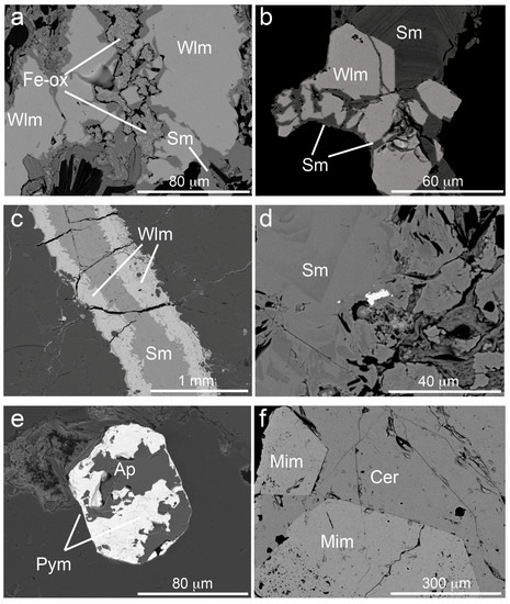 Backscatter electron SEM micrographs. Mineral chemistry was determined through EDS. (a) KDD 143-22. Willemite altered and partially replaced by smithsonite and Fe-oxy-hydroxides; (b) KDD 143-23. Idiomorphic willemite crystals, vein-crossed and partially altered to zoned smithsonite; (c) KDD 143-16. Thin willemite vein, internally filled with smithsonite; (d) KDD 143-16. Zoned crystals of smithsonite; in the center small galena remnant; (e) KDD 143-26. Fluorapatite crystal patchily replaced (Pb → Ca and Cl → F) by pyromorphite; (f) KDD 143-23. Idiomorphic mimetite crystals embedded in cerussite. Ap = fluorapatite; Cer = cerussite; Fe-ox = Fe-oxy-hydroxides; Mim = mimetite; Sm = smithsonite; Wlm = willemite.