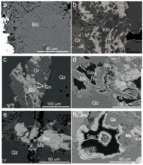 Backscatter electron SEM micrographs. Mineral chemistry was determined through EDS. (a) KDD 143-23. Baileychlore packages, randomly oriented, filling porosity; (b) KDD 143-22. Baileychlore associated with kaolinite replacing orthoclase; (c) KDD 143-26. Orthoclase crystal from the host quartzwacke partially replaced by baileychlore; fine galena is associated with the Zn-chlorite; (d) KDD 143-26. Sauconite and Zn-bearing illite growing in dissolution cavities, above mica packages; (e) KDD 143-22. Patches of baileychlore growing in between mica packages and quartz grains; (f) KDD 143-26. Dissolution cavity bordered by freely growing sauconite. Blc = baileychlore; Gn = galena; Kln = kaolinite; Ms = muscovite; Or = ortoclase; Qz = quartz; Sau = sauconite; Sm = smithsonite; Zn-ill = Zn-bearing illite.