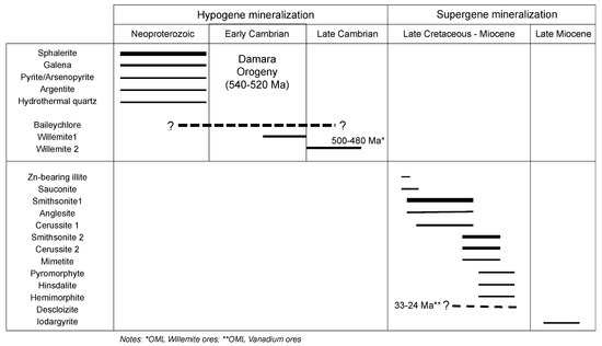 In the nonsulfides assemblage, it appears that two types of mineralization styles occur in the investigated prospect: one characterized by minerals more typically found in hydrothermal ores (i.e., willemite and baileychlore; [7]), and a second one consisting of phases genetically related to real supergene processes (i.e., smithsonite, cerussite, Zn-Pb-phosphates, etc.; [7]). In detail, the presence of willemite at Kihabe is quite surprisingly, considering that the oxidized facies of the Kihabe mineralization was considered to be related to supergene alteration processes only. Specifically, two willemite types were identified: a first, deformed massive willemite generation, and a second generation consisting of euhedral hexagonal prismatic crystals. Compared to other willemite deposits [7,30,32], the Kihabe willemite should postdate sulfides emplacement, or even form at their expenses. However, we found no clear evidence of the latter process in the analyzed Kihabe samples, as is the case with the OML deposits [30]. Accordingly, this Zn-silicate could have originated either from the interaction of late-oxidizing hydrothermal fluids with preexisting sulfide bodies, or from the direct precipitation from Zn-bearing oxidizing fluids, focused along tectonic lineaments in formerly mineralized areas. The Kihabe willemite assemblage has many similarities with the willemite occurrences described in the Berg Aukas deposit [30]. In fact, the various willemite generations recorded at Berg Aukas have been comprehensively classified as (i) early willemites, occurring as fine-crystalline to granular masses replacing sphalerite, and (ii) later willemites, taking the form of semi-massive microcrystalline masses of hexagonal crystals. Absolute dating of the second willemite generation at Berg Aukas, carried out with the Rb-Sr geochronological method [30], produced ages which yield 499 ± 63 Ma and 493 ± 2 Ma, suggesting that its formation in the Otavi Mountainland was related to hydrothermal circulation during the waning stages of the Damara Orogeny, similarly to other structurally-controlled willemite mineralizations in Southern Africa (e.g., the Kabwe deposit [33,34]). Looking at the various mineralizing events that occurred in the Otavi Mountainland, it is likely that the Kihabe willemites formed in the same period (Figure 11), during the final stages of the Damara Orogeny [30]. However, the high As concentration in the Kihabe willemite seems to be a peculiarity of this mineralized prospect, since this element rarely reaches maximum amounts of 1 wt. % in willemite, in particular structurally-controlled deposits, like Star Zinc, in Zambia [10]. The presence of As in the Kihabe willemite could be a result of the alteration of As-bearing sulfides (i.e., arsenopyrite), or could even indicate that the investigated Zn-silicate had a relatively high precipitation temperature (between 150 and 250 °C; [10]).