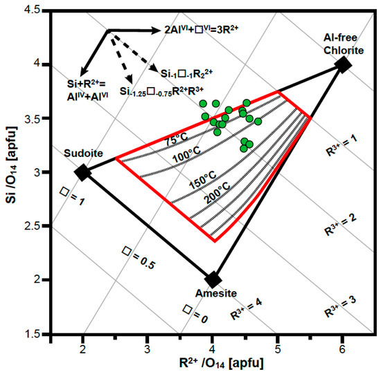 Semi-empirical graphical chlorite geothermometer of Bourdelle and Cathelineau [41], applied on the baileychlore analyses obtained with this study. In the top-left corner, the element substitution vectors are shown.