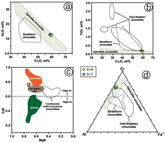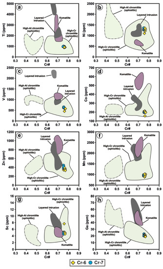 - Pagé, P.; Barnes, S.-J. Using trace elements in chromites to constrain the origin of podiform chromitites in the Thetford Mines ophiolite, Québec, Canada. Econ. Geol. 2009, 104, 997–1018. [Google Scholar] [CrossRef]