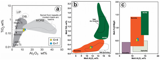 - Arai, S.; Abe, N. Reaction of orthopyroxene in peridotite xenoliths with alkali basalt melt and its implications for genesis of alpine-type chromitite. Am. Mineral. 1995, 80, 1041–1047. [Google Scholar] [CrossRef]