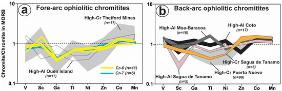 - Proenza, J.A.; Gervilla, F.; Melgarejo, J.C.; Bodinier, J.L. Al- and Cr-rich chromitites from the Mayarí–Baracoa Ophiolitic Belt (Eastern Cuba): Consequence of interaction between volatile-rich melts and peridotites in suprasubduction mantle. Econ. Geol. 1999, 94, 547–566. [Google Scholar] [CrossRef]
