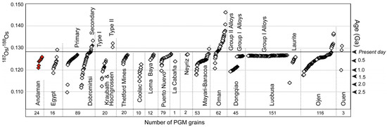 - Ahmed, A.H.; Hanghøj, K.; Kelemen, P.B.; Hart, S.R.; Arai, S. Osmium isotope systematics of the Proterozoic and Phanerozoic ophiolitic chromitites: In situ ion probe analysis of primary Os-rich PGM. Earth Planet. Sci. Let. 2006, 245, 777–791. [Google Scholar] [CrossRef]