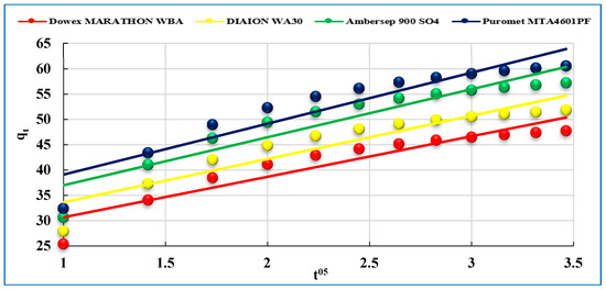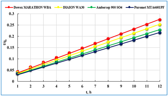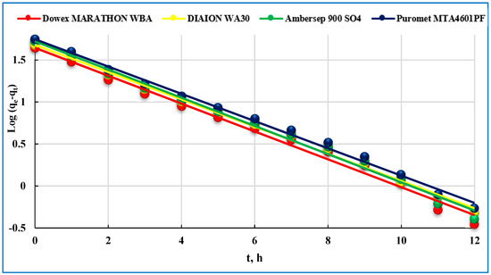 | Kinetic Models | Parameters | Dowex Marathon WBA | Diaion WA30 | Ambersep 900 SO4 | Puromet MTA4601PF |